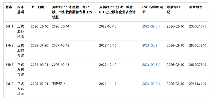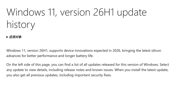 更新支持上,搭载26H1版本的设备,将与24H2、25H2版本设备一样接收月度安全、质量及新功能更新,但存在两项限制:不支持热补丁更新,安装更新后可能需重启设备;而且这一版本在2026年下半年无法更新至下一年度功能更新,因其一系统核心与其他版本不同,不过微软承诺未来会提供官方升级路径。技术上,该版本优化了新硬件适配,未新增专属功能,属于过渡性版本,且不再预装.NET Framework 3.5,需用户手动安装。
