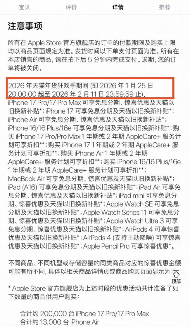 目前天猫年货节针对iPhone 17系列的优惠并不多,只有iPhone 17系列领券立减300元、iPhone Air叠加惊喜券、国补至高立减2500元,标准版iPhone 17并没有任何优惠。关键是这些优惠只截至2月11日24点,超过截止日期后就不能使用优惠了,而且春节期间还不发货。