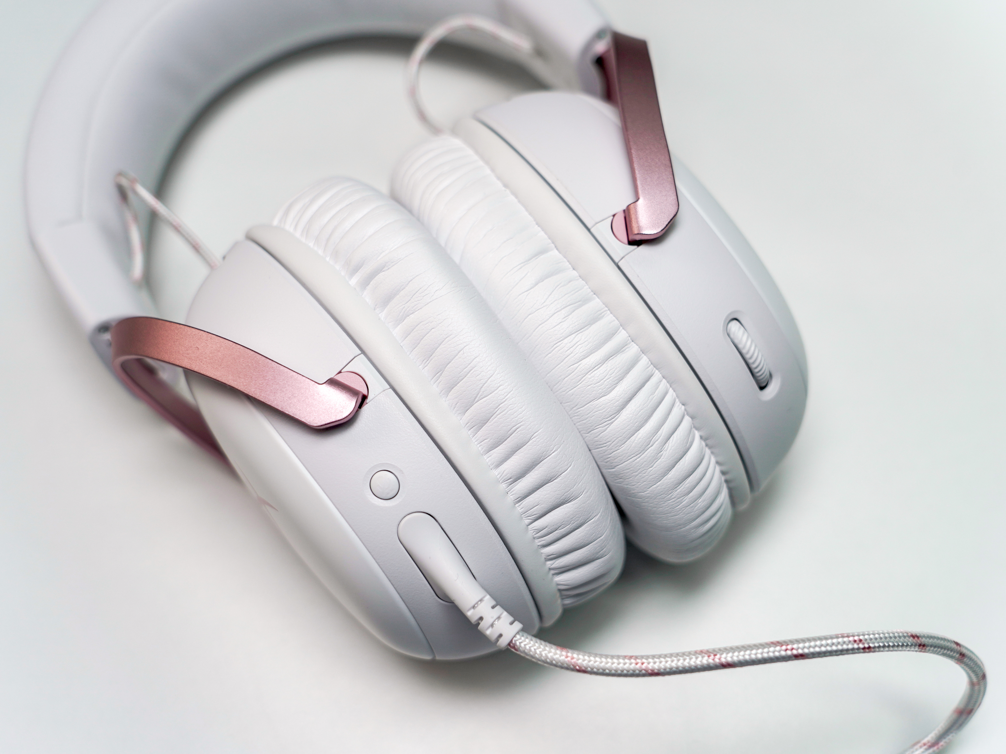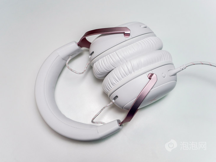 按键方面,HyperX飓风3雾光粉非常简约,耳机左侧配有一个麦克风禁用按键,一键关闭麦克风的设计十分贴心,显眼的红灯静音指示灯可以直观地确认状态,有效避免了意外开麦的尴尬。右侧则是配备一个音量调节旋钮,顺滑的旋拧手感和适中的阻尼感让你可以轻松地调节到合适的音量。