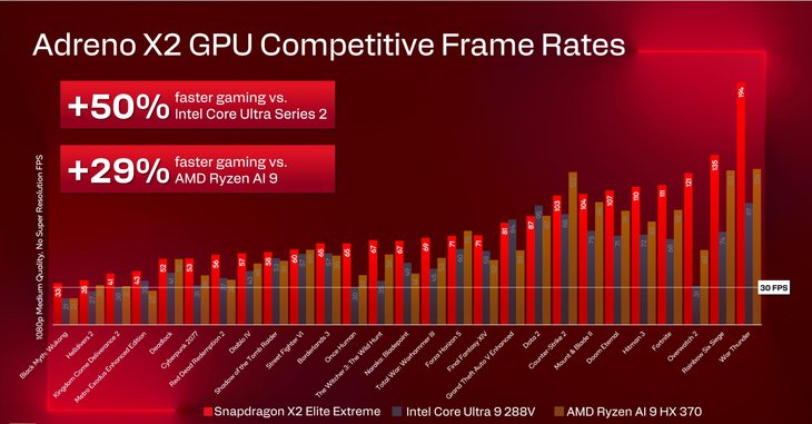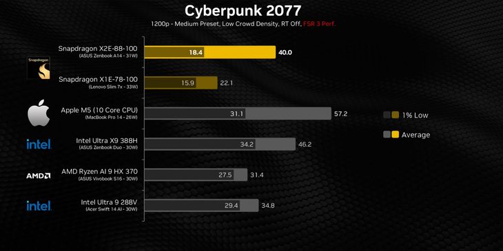 骁龙X Elite曾在3A游戏中展现出尚可的帧率表现,但兼容性与优化不足的短板始终制约其发挥。如今,高通推出的骁龙X2 Elite针对性解决了前代的多数痛点,游戏帧率实现了显著跃升,不过在与苹果M5的最新对比测试中依旧有着不小的差距。在Hardware Canucks的测试中,骁龙X2 Elite在CPU计算能力上曾多次击败苹果M5,但在游戏场景下,苹果芯片的优势依然突出。测试选取了《反恐精英2》《赛博朋克2077》《博德之门3》三款热门游戏,需要注意的是,本次测试的骁龙X2 Elite运行于预生产笔记本,驱动与固件仍处于beta阶段,最终零售机型的表现或有变化。