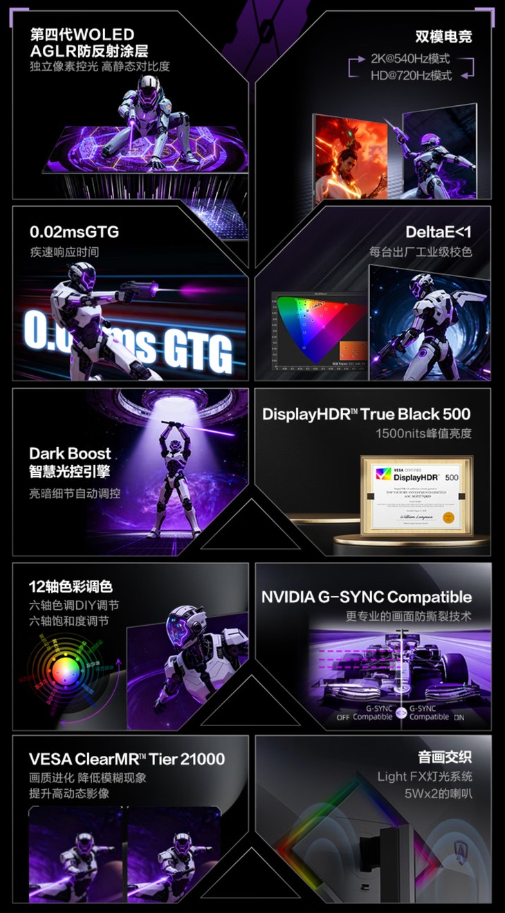 该款显示器配备WOLED面板,支持2K@540Hz与720P@720Hz双模一键切换,满足不同游戏场景需求,屏幕响应时间最快可达0.02ms GTG,并获得ClearMR Tier 21000认证,画面流畅度表现突出。显示效果方面,该面板峰值亮度最高达1500尼特,支持HDR Ture Black 500标准,拥有10bit色深和99.5% DCI-P3色域覆盖,官方标称ΔE<1,护眼方面则支持硬件级低蓝光和DC调光技术。