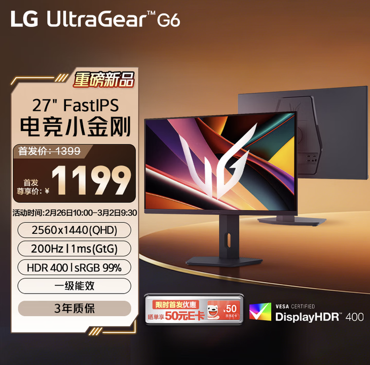 近日,LG电子旗下高端电竞品牌UltraGear推出G6系列全新产品27G610A电竞显示器,目前该新品已正式登陆京东电商平台开启预售,官方定价1199元,厂商同步提供三年全国联保服务。同时该产品上线限时首发优惠活动,参与晒单可享50元京东E卡,具体活动规则可咨询平台在线客服。