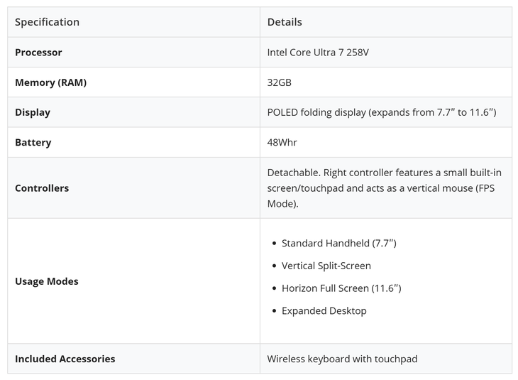 该设备核心突破在于可折叠POLED屏幕,能在7.7英寸与11.6英寸间切换,搭配可拆卸无线手柄实现四种使用模式:折叠状态搭配手柄为标准掌机模式,便携性拉满;垂直分屏模式可一边游戏一边看直播;水平全屏模式展开为11.6英寸大屏,提升沉浸式体验;最具创新性的扩展桌面模式,对接配套无线键盘,右侧手柄可作垂直鼠标,变身笔记本满足轻办公需求,实现“一机兼顾工作与娱乐”。