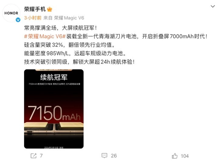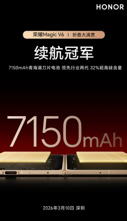 今日,荣耀手机官方微博正式官宣,旗下重磅折叠屏旗舰荣耀Magic V6将搭载全新一代7150mAh青海湖刀片电池,官方宣称此举将正式开启折叠屏手机的7000mAh时代,作为行业内电池容量最大的折叠屏旗舰,该机在续航能力上实现跨越式突破,引发行业及消费者的高度关注。