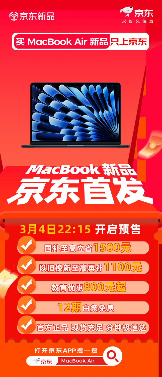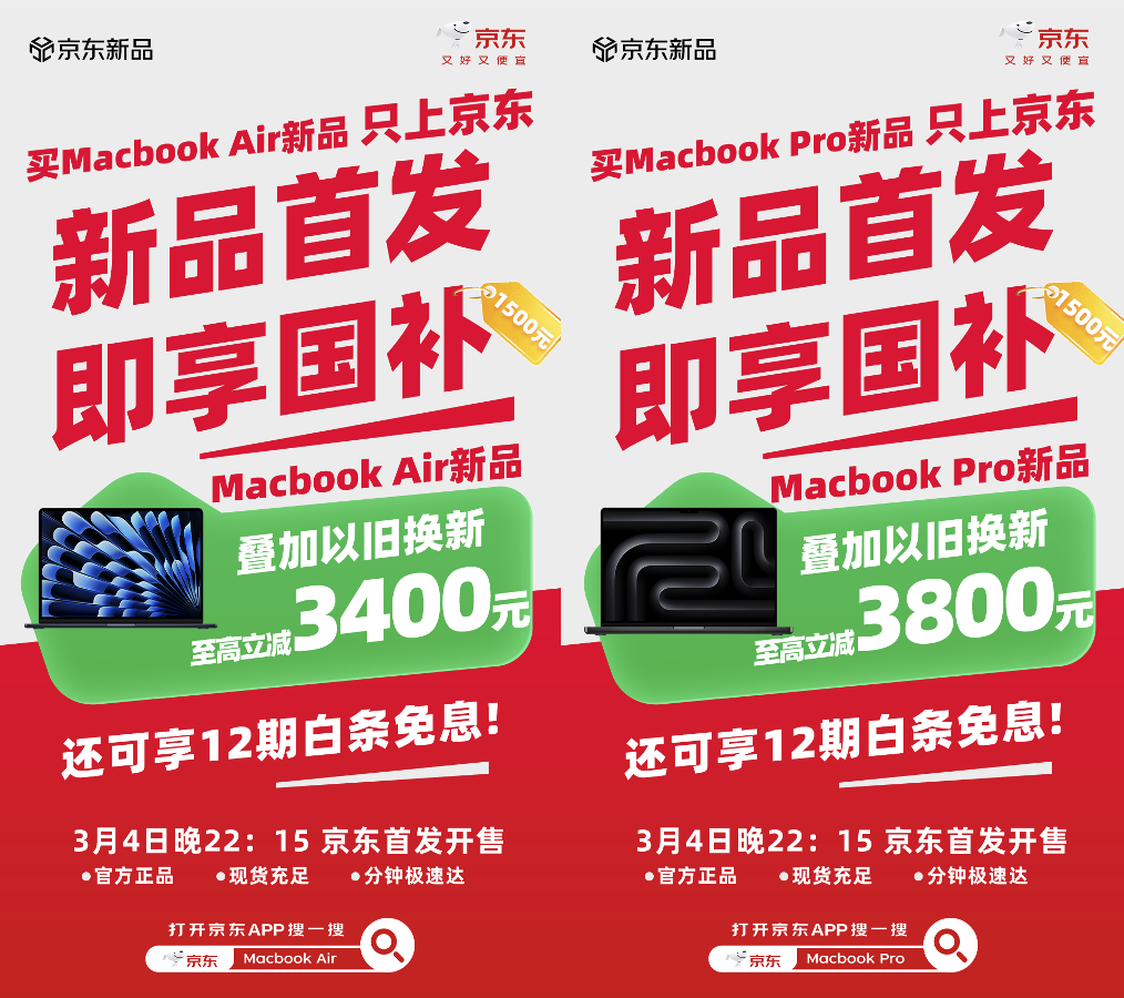 3月4日22点,2026新款MacBook Air与MacBook Pro正式发布,3月4日22:15开启预购,3月11日正式发售。目前,两款新品已在京东上线专属预约通道,用户打开京东App搜索“苹果新品福利”即可直达活动页面。购买新款Macbook Air享国补15%至高1500元、教育优惠800元起、以旧换新补贴至高1100元,购买新款Macbook Pro享国补15%立减1500元,教育优惠1200元起,以旧换新补贴至高1100元,均可支持12期免息,为用户带来更实惠的焕新体验。