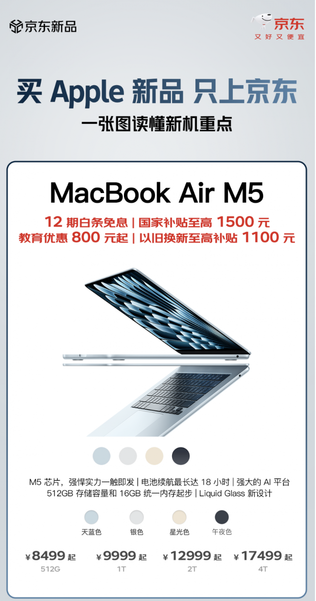在存储配置上,搭载M5芯片的新款MacBook Air迎来重磅升级,采用速度更快的固态硬盘技术,起步存储容量较上代机型翻倍,达512GB,高可选配4TB,为重要任务留出充足空间。外观设计上,新品采用轻薄耐用的精美铝金属机身设计,配备绚丽的Liquid视网膜显示屏和 1200万像素Center Stage摄像头,电池续航时间长可达18小时,并配有支持空间音频的沉浸式音响系统。