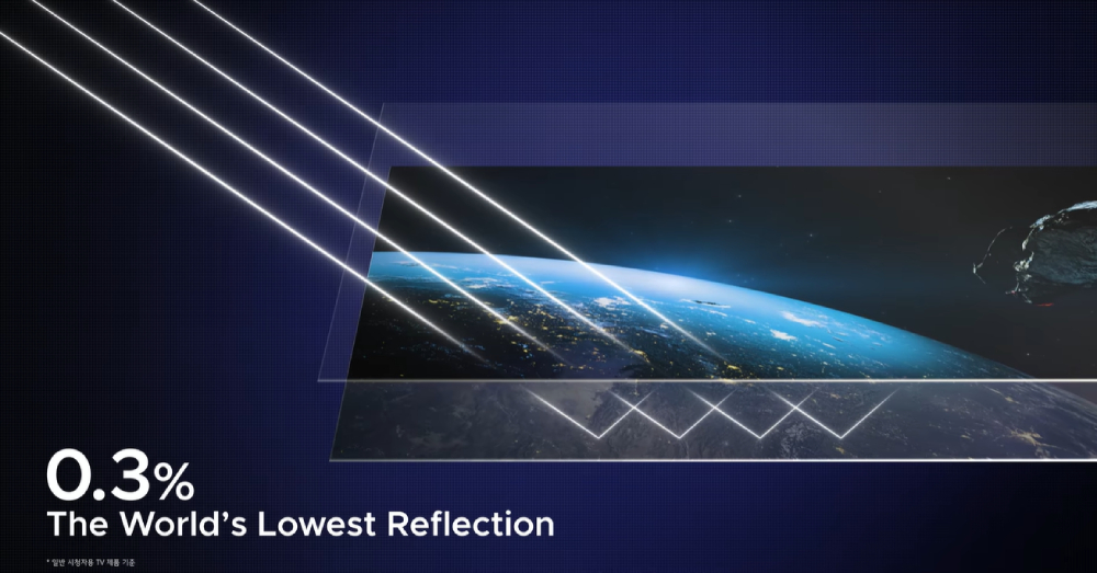 但Tandem WOLED叠曜屏搭载独有的超低反射技术(Anti-Reflection),通过定制化偏光片与低反射内部元件设计,将反射率降至行业最低的0.3%(基于550纳米)。这样一来,即使在强光照射的家庭或办公室环境中,屏幕依然能保持高对比度、准确色彩和纯正黑色,画质几乎不受影响。