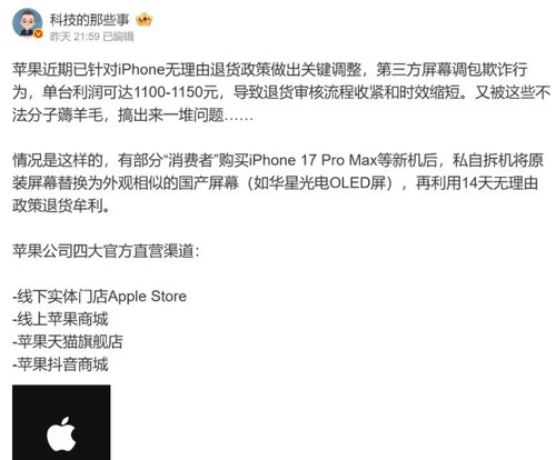 坑惨消费者!苹果回应买iPhone换屏退货赚差价,再次收紧售后政策