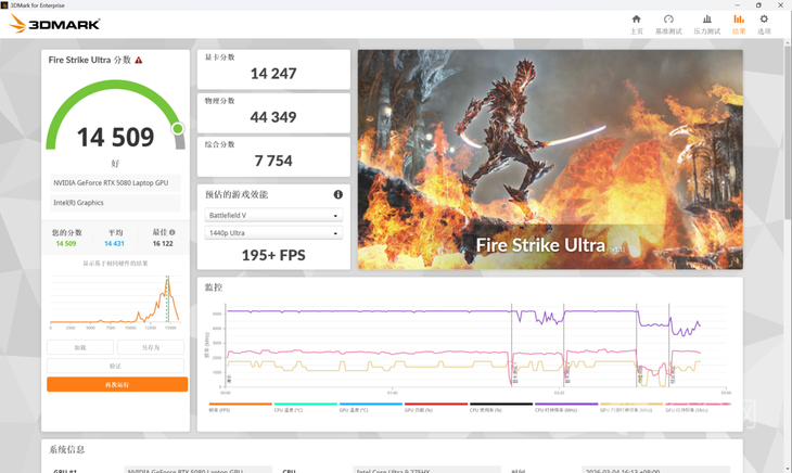 在3DMark基准测试中,Time Spy Extreme综合得分10621分,Fire Strike Ultra得分为14509分,表现与同配置机型差不多,充分发挥出了RTX 5080移动端的满血性能。