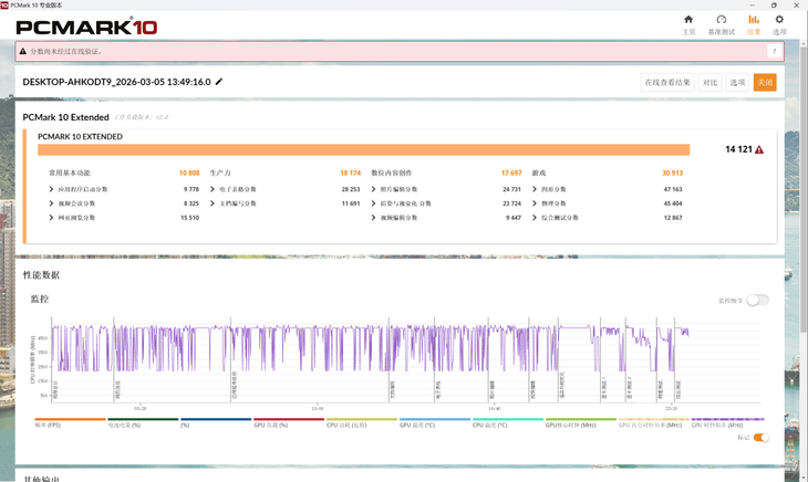 在PCMark10 Extened整机性能测试中,Alienware外星人18 Area-51游戏本常用基本功能得分10808,生产力得分为18174,数位内容创作得分为17697,游戏得分为30913,综合得分为14121,拥有出色的表现,在游戏之余,还可以胜任高强度的生产力或是创作。