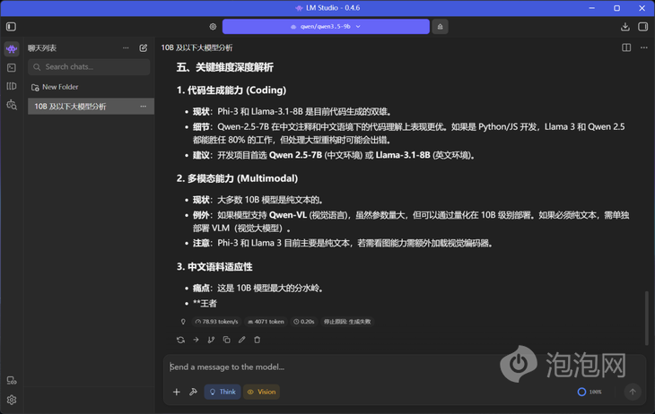 我们也使用LM Studio,实际体验了本地大模型对话体验,在本地运行Qwen3.5-9B大小的本地模型下,生成总计4071个token的答案,首个token用时0.2秒,每秒输出78.93个token,反应速度和生成速度都极为出色,可以充分满足用户本地使用大语言模型的需求,16GB的大显存搭配澎湃算力还能支持更多样的AI应用。