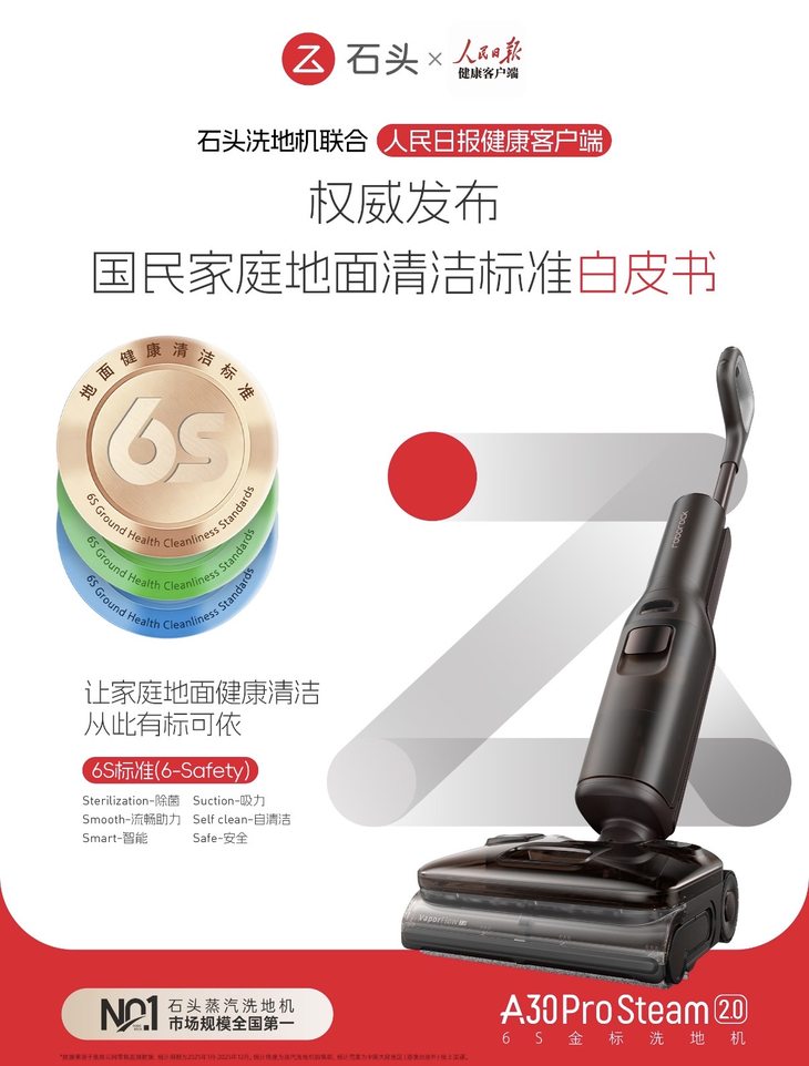 “双冠”佳绩背后,是石头科技对家庭健康清洁深层次的洞察。正是基于这种深厚的用户积累与市场话语权,石头科技在AWE 2026展会现场,与人民日报健康客户端共同发布《家庭地面清洁标准白皮书》,提出“6S地面健康清洁标准”,从除菌、吸力、智能化、自清洁、安全等多个维度,全面规范家庭地面清洁要求。而A30 Pro Steam 2.0正是能够实现这一标准的代表性产品,将销量领先优势延伸为行业标准示范,体现了石头科技在技术和健康理念上的全方位布局。