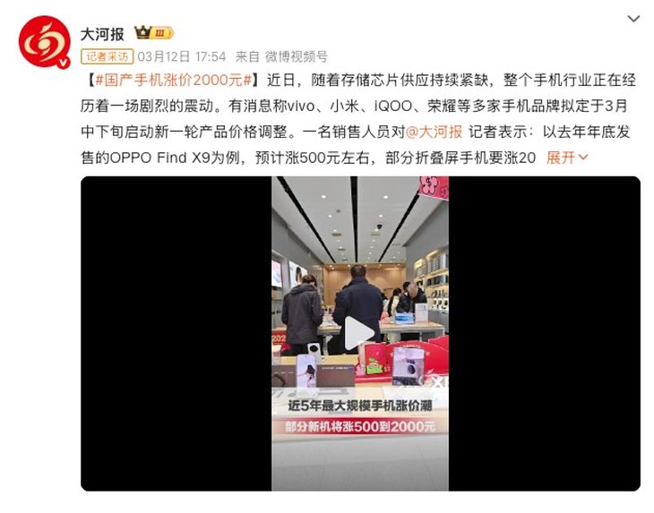 目前已有多品牌经销商确认涨价:OPPO体验店表示3月16日起涨价,OPPO Find X9预计涨500元,部分折叠屏涨2000元;vivo店员称涨价已成定局,即将发布的X300 Ultra会比去年同级别旗舰更贵,老款机型不再降价;荣耀店员透露,低端机或变相涨价,刚发布的Magic V6大内存版本比上一代涨1000元,近期到店购机者激增,都是赶在涨价前下手。