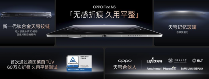OPPO Find N6以“一马平川”的无折痕设计,成为折叠机无痕时代的开创性产品。这款手机不仅开箱平,久用依旧平,是莱茵实验室测试过的全球最平整折叠屏。得益于其新一代钛合金天穹铰链和天穹记忆玻璃,行业创新芯片级高分子3D打印技术,让屏幕可靠有韧性,展开还能自修复。