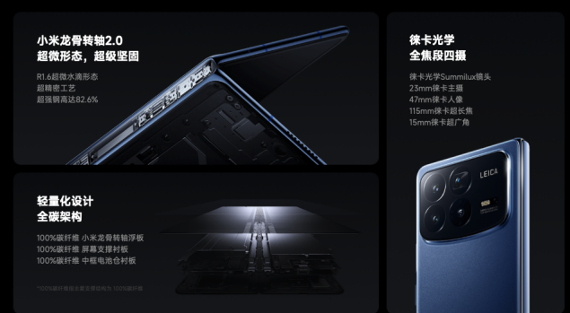 - 小米MIX Fold4:它拥有全碳架构与龙骨转轴2.0,整机重量仅226g,折叠厚度9.47mm、展开厚度4.59mm,具备IPX8防水和官方认证50万次折叠测试。后置徕卡四摄,支持5X潜望镜、双长焦双微距。性能上搭载骁龙8 Gen3,LPDDR5X + UFS4.0,支持50W无线充电和双向卫星通信。屏幕素质出色,内屏有1700nits全屏最大亮度,3000nits峰值亮度。