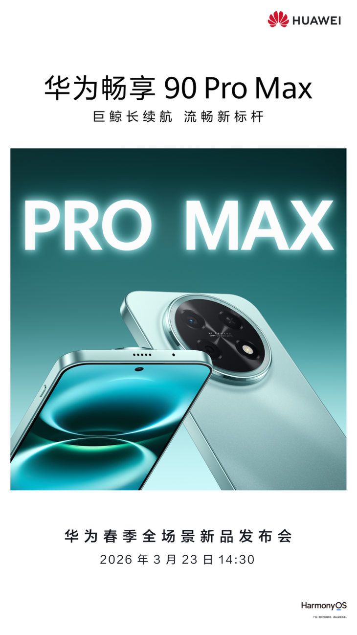 3月16日,华为终端官方微博正式发布华为春季全场景新品发布会预热海报,并同步释出华为畅享 90 Pro Max与华为畅享 90 Plus两款产品的主海报,明确华为畅享 90系列将亮相3月23日的新品发布会。同时,官方还对外释放续航、流畅、防诈等核心产品卖点,正式拉开新品预热大幕。今天,我们就结合官方透露的种种信息,一同来看看这款新品究竟有何亮点。