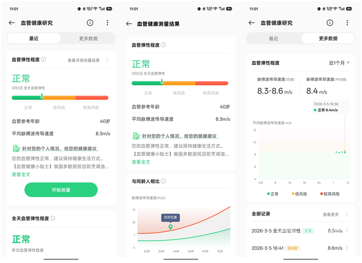 用户在OPPO Watch X3以及手机APP【健康研究】当中可以查看健康研究的详细信息,比如血管健康研究中,可以查看你与同龄人的差异,还能够查看不同时间记录的信息,方便了解一段时间内血管健康的变化。