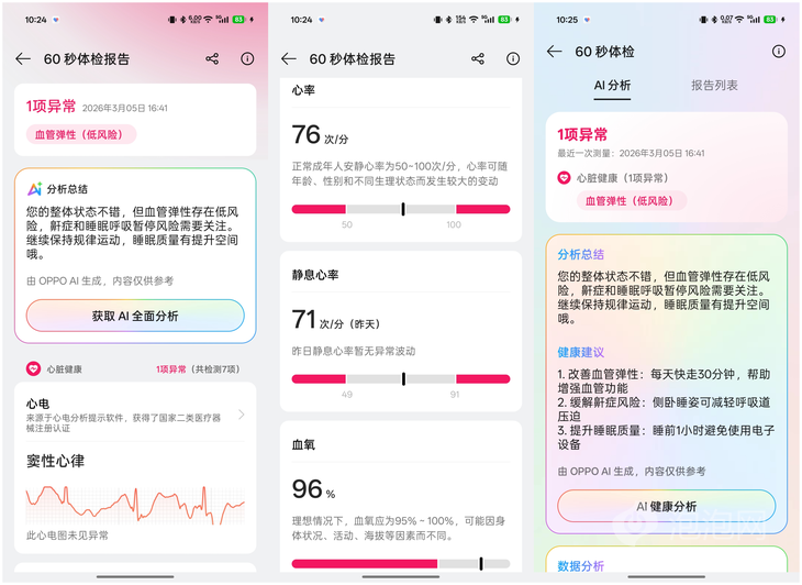 60秒体检在OPPO Watch X3上也迎来了升级,不仅可以对身体状况进行检测,还能够借助专业的AI健康模型来对体检结果进行分析,并提供个性化管理建议。60秒体检是一项非常方便的功能,定期用它来对身体进行健康评估,让你更了解你现在的身体状态。