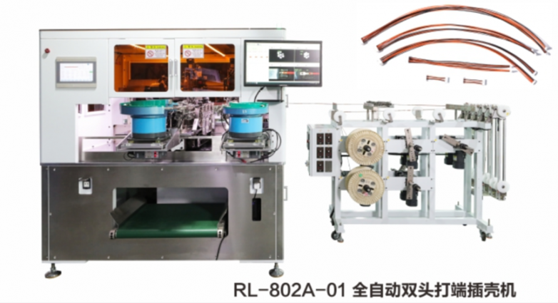 瑞领自动化RL-802A双头插壳一体机,可同步加工不同OD、不同颜色(最多可达10种)的线材,在消费电子、通信系统等线束加工场景中,实现效率与品质的动态平衡,适配多品种柔性生产需求。