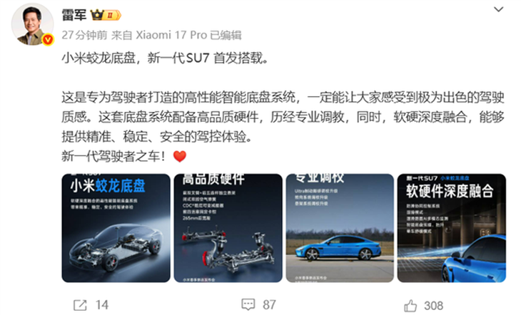 雷军正式宣布,小米蛟龙底盘由新一代 SU7 全球首发,新车定位 “新一代驾驶者之车”。他表示:这是专为驾驶者打造的高性能智能底盘,硬件规格拉满、专业调校到位,且实现软硬深度融合,可带来精准、稳定、安全的出色驾控质感。