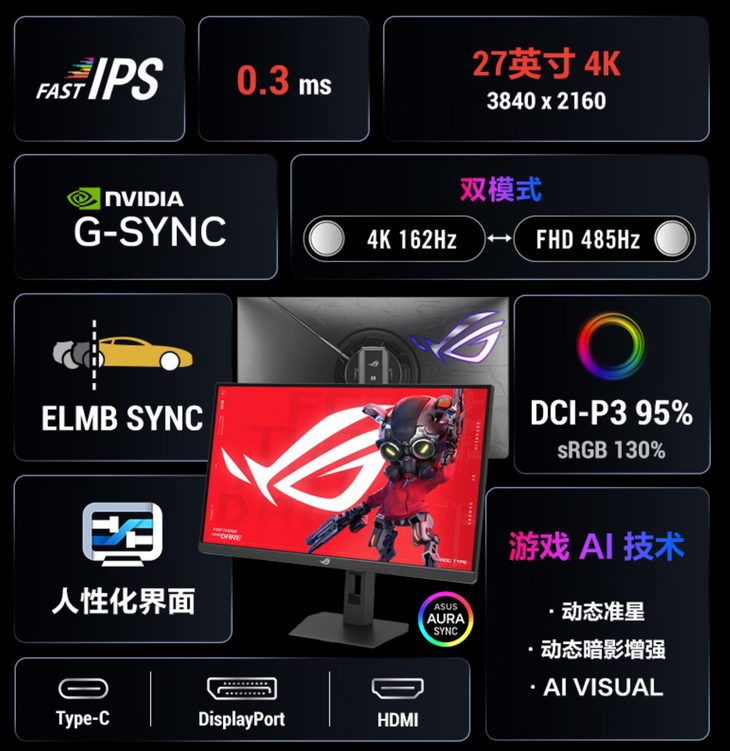 核心显示规格上,ROG STRIX XG27UCGR搭载27英寸Fast IPS面板,支持10bit色深,水平与垂直可视角度均达到178度。模式切换方面,其高刷新率模式可实现FHD分辨率485Hz超高刷新率,高分辨率模式则能输出4K分辨率162Hz画面,覆盖不同游戏类型的核心需求。同时,这款显示器的灰阶响应时间(GtG)可低至0.3ms,能大幅减少动态画面的拖影与模糊问题;光学参数上,其典型亮度400尼特、HDR峰值亮度600尼特,典型对比度1300:1,色域覆盖达到95% DCI-P3与130% sRGB,在电竞属性之外,也具备了不俗的色彩还原能力。
