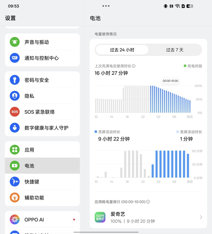 在满电状态下,以50%亮度、50%音量,使用内屏看在线视频,经过一晚上9小时20分不间断播放后,电量还剩余45%,这样的续航表现在当下的折叠屏品类中可谓十分亮眼,日常作为主力机使用,满足一整天的续航需求绰绰有余,依托功耗优化与大电池优势,OPPO Find N6完全可以摆脱折叠屏的续航焦虑。