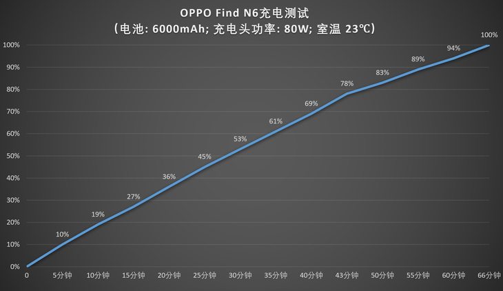 在持久续航的基础上,OPPO Find N6还配备了兼顾速度与场景适配的快充组合,80W 有线超级闪充搭配50W无线闪充,让电量回血变得高效又便捷,经过我们的实测,10分钟能充到20%,30分钟就能充到51%,66分钟就能将手机充满,平时利用碎片化时间就能快速补电。