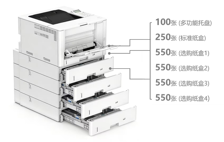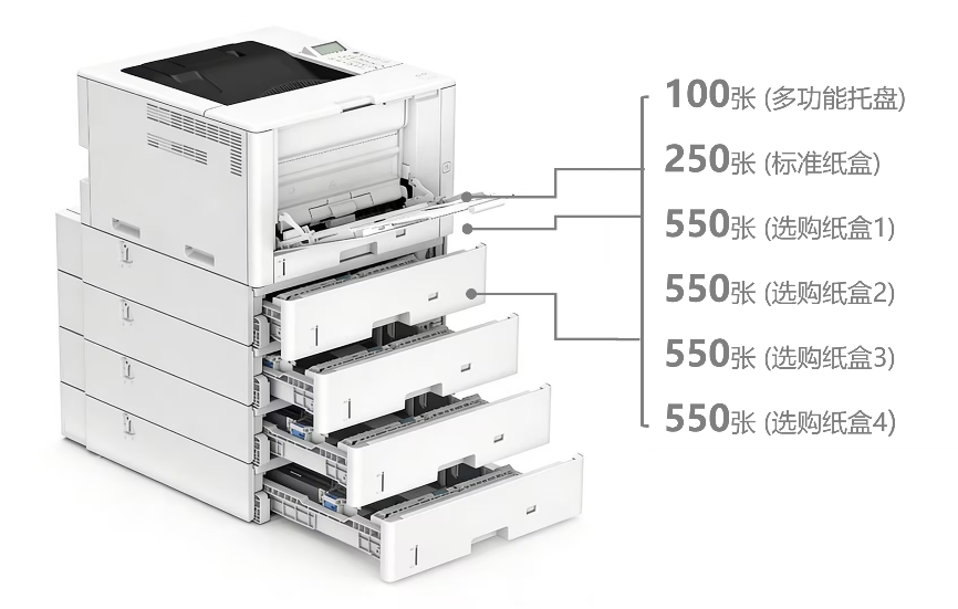 LBP811Cx支持6种以上纸张,进纸容量最高可达2,550张