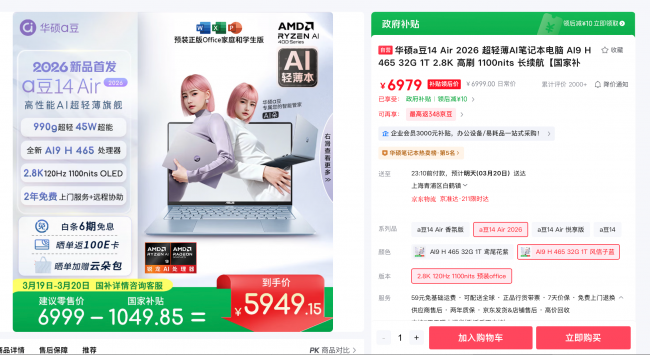 当前购机部分地区可领取至高15%国家补贴,到手价低至5949.15元,还可享受6期免息,晒单返100E卡、赠云朵包,以及专属a豆无忧服务计划,包含 2年硬件上门服务、2年无限远程协助、2年好屏无忧换新、2年整机保修服务,多重贴心保障让入手无后顾之忧。感兴趣的小伙伴上京东搜索#华硕a豆14 Air 2026#了解更多详情。