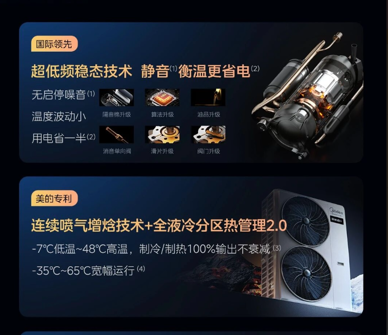 为什么超低频如此重要?中央空调压缩机的运行频率直接决定场景适配能力。传统中央空调在低频运行时存在明显技术短板——当室内只开启1-2台内机时,外机往往因低频能力不够而频繁启停,导致温度剧烈波动、噪音扰人。用户常常面临“半夜被热醒”或“被压缩机声音吵醒”的困扰。过去三十年,行业对低频能力的优化进展缓慢,不是因为技术难度不可逾越,而是因为产业链分工固化导致的创新惰性。