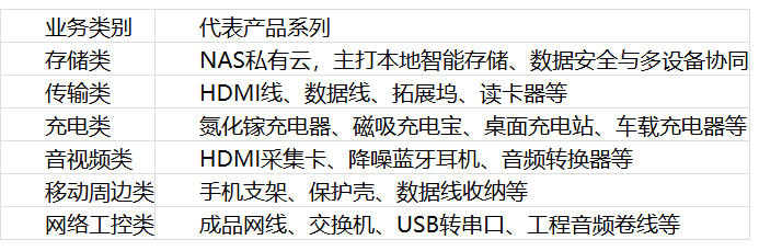 绿联科技的产品矩阵逐步丰富,满足用户在移动办公、居家生活、户外出行等场景下,智能设备的交互连接、快速充电、数据存储与传输、安全防护等需求。目前,公司已在传输类、音视频类、充电类、存储类和移动周边类为用户提供系列产品。