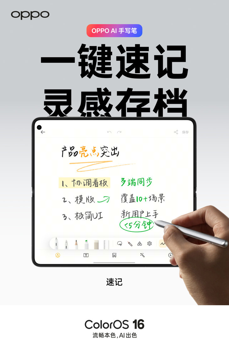 如果说全景自由窗重塑了多任务处理效率,那么OPPO AI手写笔则彻底重构了移动办公的交互逻辑,它不止是简单的记录工具,更是一套完整的高效可视化沟通方案。这支手写笔仅重4.8g,握持轻盈不累手,搭配专属保护壳可实现磁吸收纳与充电,充电3分钟就能连续书写1小时,首销期手写笔+磁吸收纳壳套装仅需499元,就能解锁办公效率的全面跃升。