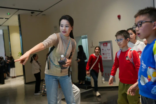 亲子家庭有序走进itc智慧展厅,首先映入眼帘的是产品展示长廊,大家在这里驻足观看企业科普动画,深入了解企业的发展历程、品牌文化,以及音视频产业的创新历程与辉煌成就。