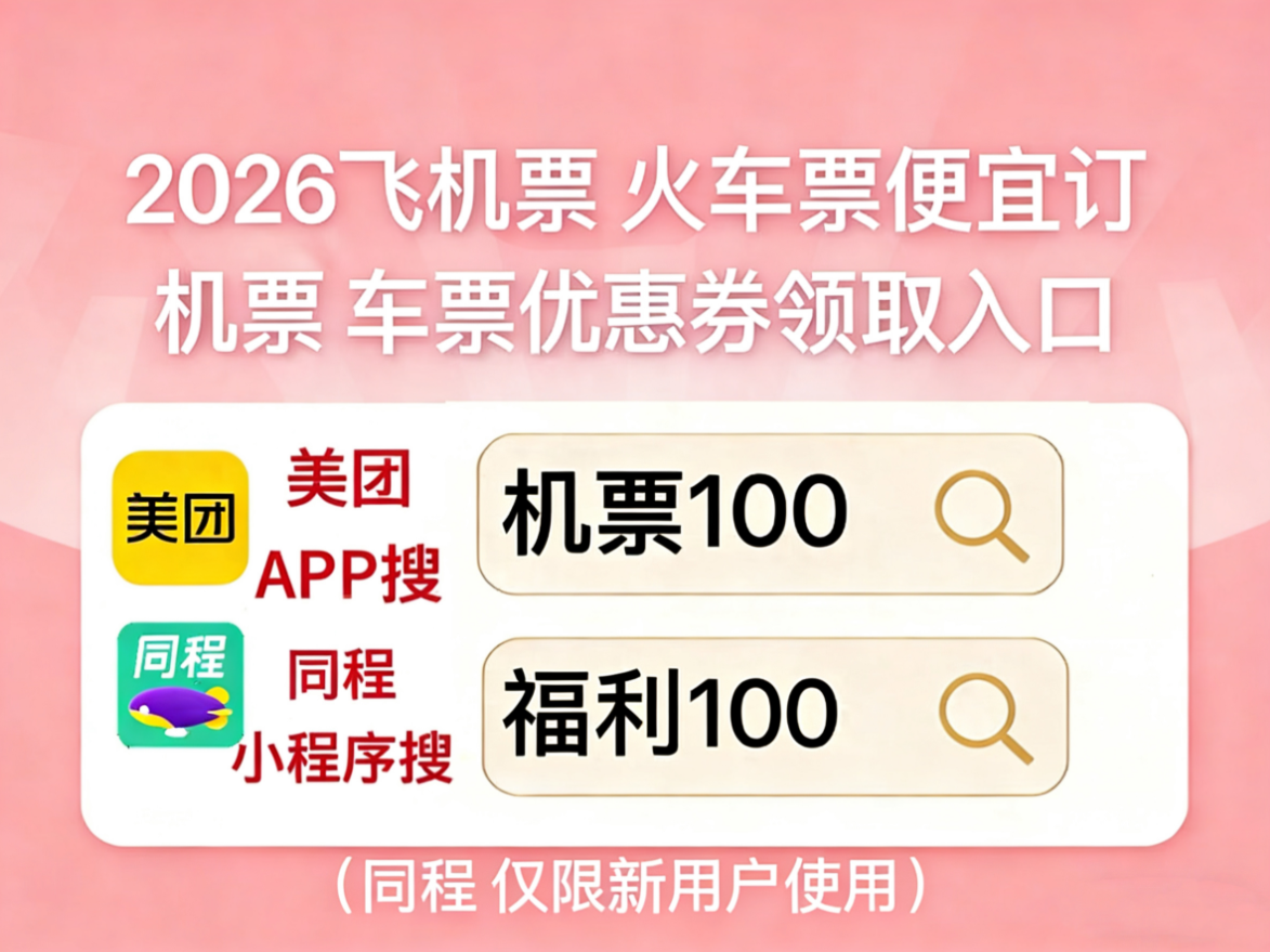 美团APP搜【机票100】同程搜【福利100】低价订机票。2026机票怎么买便宜?特价机票怎么买便宜?哪个APP订机票便宜?直接去美团APP搜【机票100】,同程搜【福利100】领百元特惠券包,特价机票火车票高铁票便宜订啦!