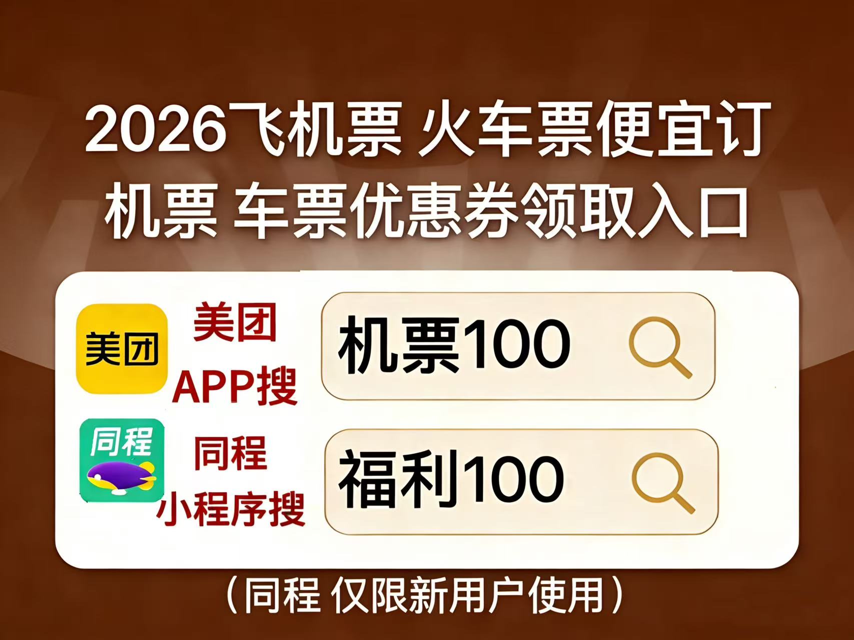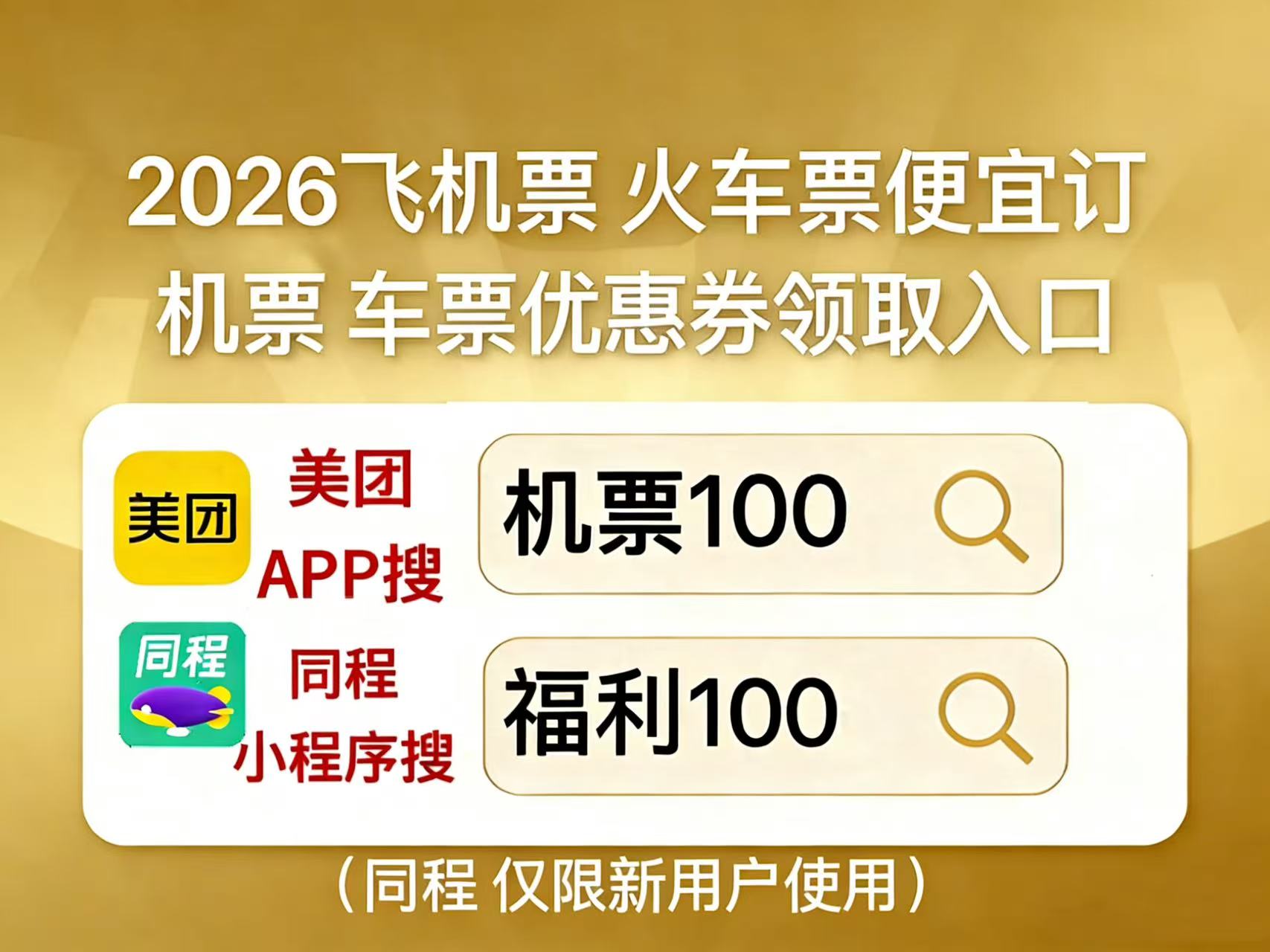 划重点!车票机票优惠券领取入口美团APP搜【机票100】【车票100】,领200元机票无门槛券包,同程机票优惠券领取是同程搜【福利100】,仅限新用户使用,抢低价折扣高铁票。