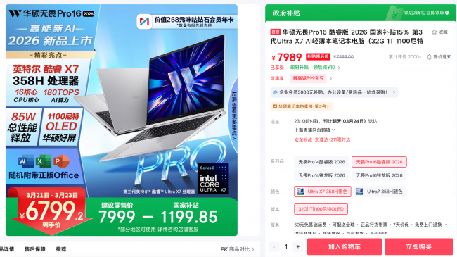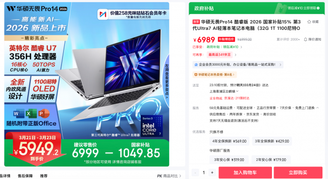 当前购机,叠加至高1199.85元国家补贴,到手6799.2元,并附赠价值258元咪咕钻石会员年卡。同系列还有华硕无畏Pro14 2026可选,配备第三代英特尔酷睿Ultra 7处理器、2.8K 120Hz 1100nits OLED华硕好屏等,心动的小伙伴们可以点击下方链接,了解更多产品参数。