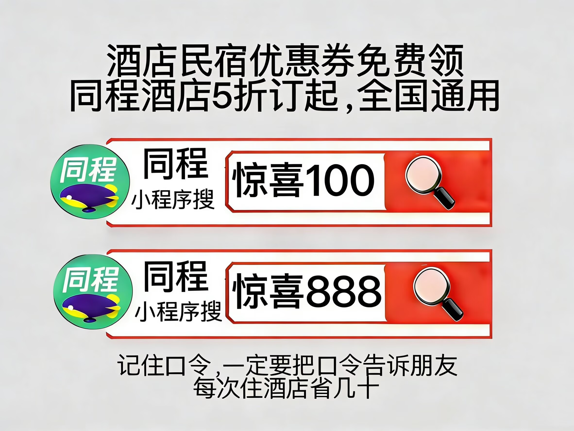 划重点!同程酒店优惠券口令领取入口同程小程序搜【惊喜100】同程民宿优惠券口令是同程搜【惊喜888】,领酒店民宿150元无门槛券包,全国酒店预订5折起,周末节假日低价订酒店。