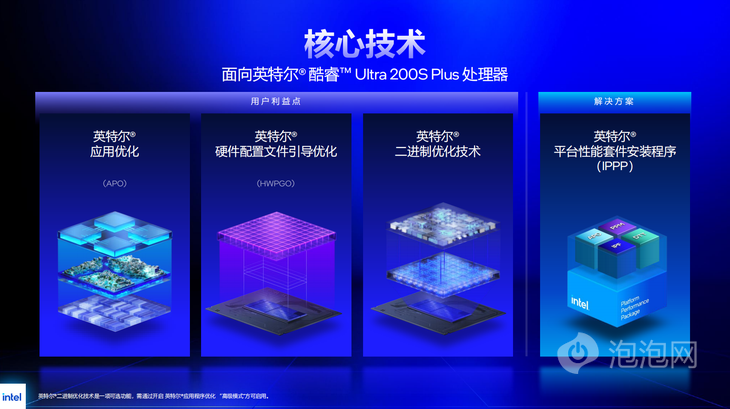不仅如此,英特尔酷睿Ultra 200S Plus还带来了全新的软件性能优化,依托整合于IPPP平台性能套件的三层一体化软件体系实现。除了我们熟悉的APO进一步扩大了应用范围之外,全新的iBOT带来了x86架构的原生指令级优化,通过识别程序运行中的缓存命中率、分支预测误差、硬件资源争抢等瓶颈,重排二进制指令、优化代码布局与内存访问方式,理顺CPU运行流水线,在程序加载阶段完成无感优化,不额外增加运行负载,以此提升处理器IPC。二者分别从系统级调度与应用级指令层面协同发力,搭配底层基础驱动形成完整优化闭环,实现性能提升。
