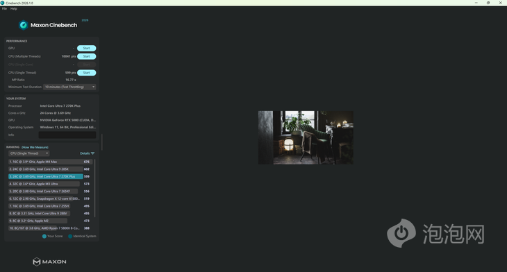 CineBench是业界通用的处理器基准测试软件,我们也使用了不同的版本进行了测试。在最新版本的Cinebench 2026当中,Ultra 7 270K Plus十分钟循环测试成绩为单核599pts,多核10041pts,多核成绩相比Ultra 7 265K提高了7.7%左右,单核成绩则是有着24%的提升。