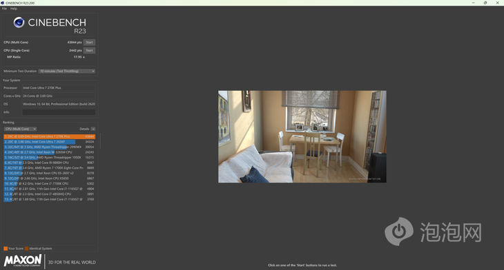 在软硬件双升级的情况下,全新的Ultra 7 270K Plus在基准性能上表现如何呢。(*以下测试结果均在BIOS默认设定、开启内存XMP超频的情况下测得,测试结果仅代表泡泡网实验室环境下当前硬件配置与软件版本下的成绩)