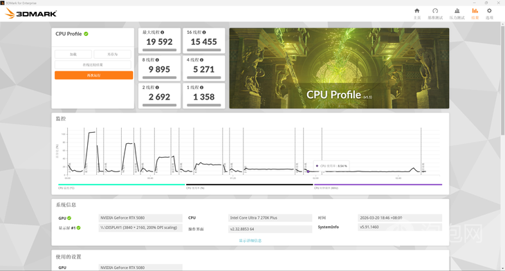 而在更加贴近实际使用的3DMark CPU Profile测试当中,Ultra 7 270K Plus单线程成绩为1358分,最大线程成绩为19592分,1线程成绩基本持平,最大线程提升14.5%。