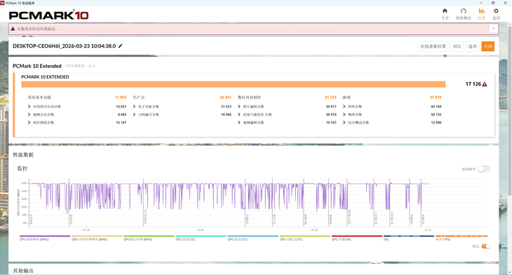 首先,在PCMark 10中面向更多工作负载的PCMark 10 Extend测试中,Ultra 7 270K Plus搭配整个测试平台得分高达17126分,其中常用基本功能得分11902分,生产力得分24431分,数位内容创作21273分,游戏性能子项高达37579分,有着非常出色的性能表现。