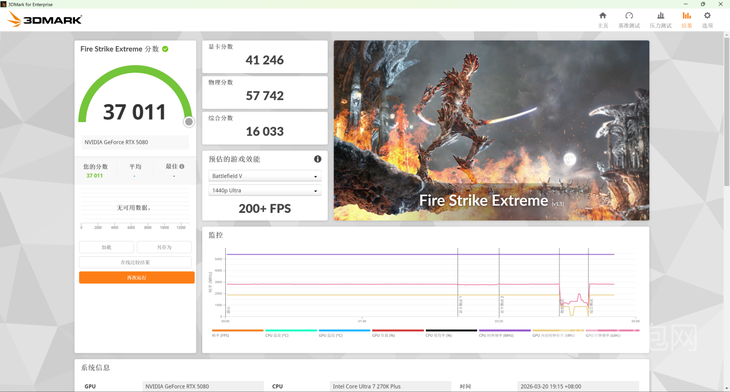 而在Fire Strike、Fire Strike Extreme Fire Strike Ultra三个场景下,Ultra 7 270K Plus的物理分数分别为57662/57742/56680,对比上代Ultra 7 265K有着13%左右的领先,代际提升也十分明显。