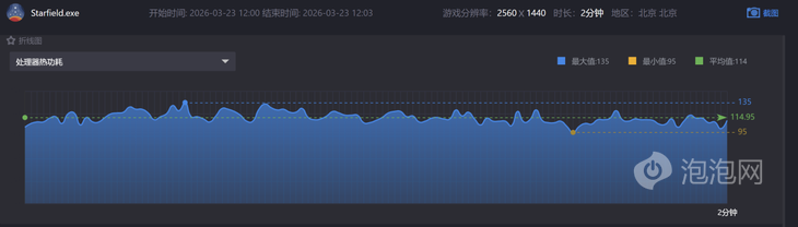 而在功耗方面,我们也在实际运行性能要求不低的《星空》时进行了记录,在记录的时间段当中平均功耗为115W,整体还是比较节能的,长时间游戏也不会出现过热降频的情况。