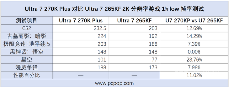 而在对于游戏体验同样关键的1% low帧指标当中,Ultra 7 270K Plus对比上代Ultra 7 265KF的领先与平均帧上的表现基本一致。整体对比上代的领先幅度还是非常不错的,在游戏中可以提供更加流畅不卡顿的体验。