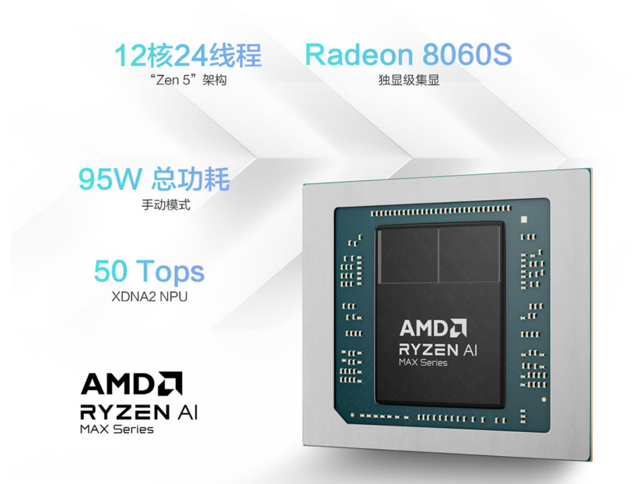 这款最新的锐龙 AI Max+ 系列处理器结合了高能效的AMD “Zen 5” CPU 核心、AMD Radeon 8060S 系列显卡,以及基于第二代 AMD XDNA 架构的 NPU,带来出色的整体性能。无论是加速大语言模型、渲染高分辨率媒体内容,还是在高设置下畅玩当代主流游戏,锐龙 AI Max+ 系列处理器都能在高端超轻薄设计中提供全方位、不妥协的性能表现。