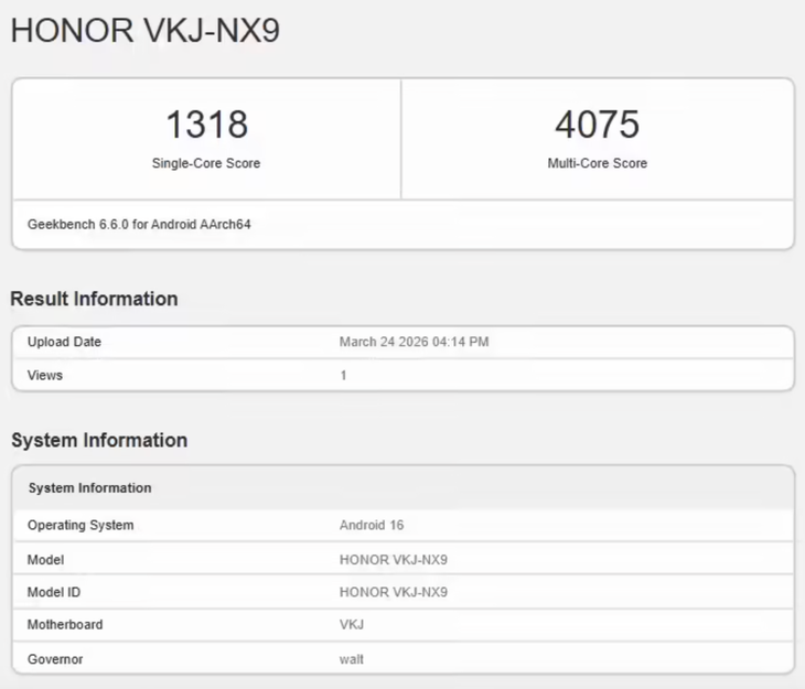 据悉,本次现身 GeekBench 跑分库的机型型号为 VKJ-NX9,结合 GSMA IMEI 数据库信息可确认,该机型对应荣耀 600 手机,这也是荣耀数字系列中首款明确曝光跑分的新机。其在 GeekBench 6.6.0 版本中的跑分表现亮眼,单核成绩达 1318 分,多核成绩 4075 分,整体性能表现符合其中端次旗舰定位。