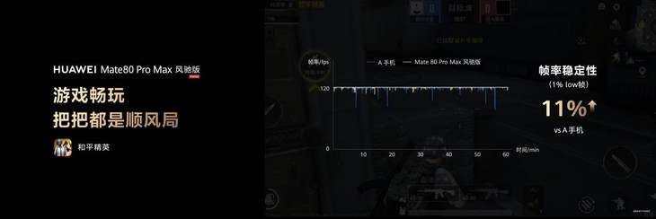 出色的散热表现也让手机成为游戏利器,在《王者荣耀》《和平精英》等主流游戏中,风驰版可稳定运行120帧模式,游戏画面流畅度(1% low帧)较Mate 70 Pro+提升约50%,操作丝滑无卡顿。