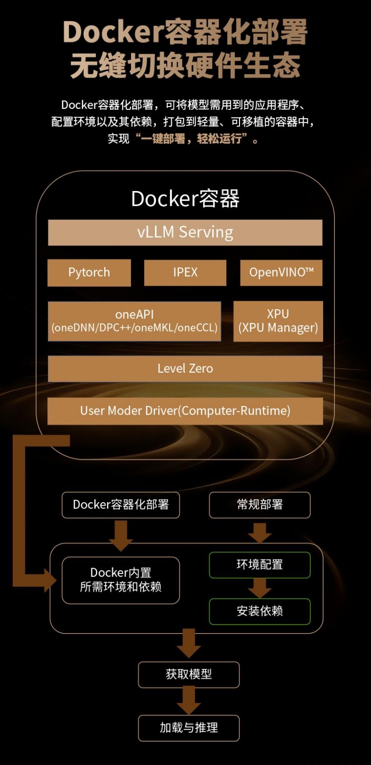MAXSUN Intel Arc Pro B70系列原生支持Pytorch框架,并经过ISV权威认证,保障主流专业软件的稳定与高效;同时,支持基于vLLM的Multi-Arc,为大规模语言模型部署提供开箱即用的优化体验。Docker容器化部署可将模型需用到的应用程序、配置环境及其依赖,打包到轻量、可移植的容器中,实现“一键部署,轻松运行”。