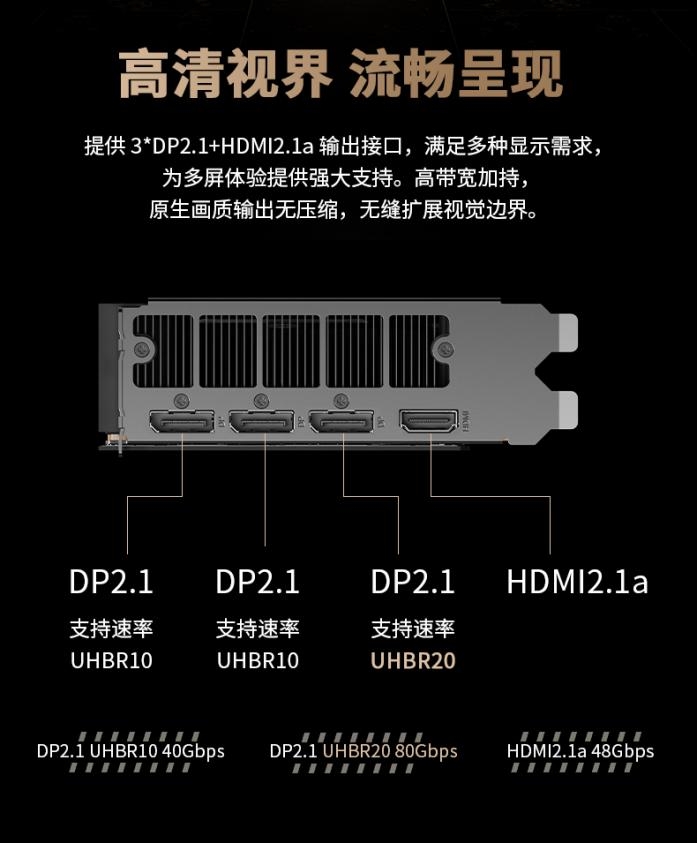 显卡均提供3*DP2.1+HDMI2.1a输出接口,满足多种显示需求,为多屏体验提供强大支持。高带宽加持,原生画质输出无压缩,无缝扩展视觉边界。(*示意图为MAXSUN Intel Arc Pro B70 32G Turbo,Fanless版本接口速率有所不同,请以对应产品规格为准)